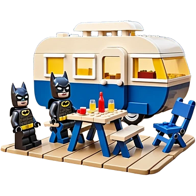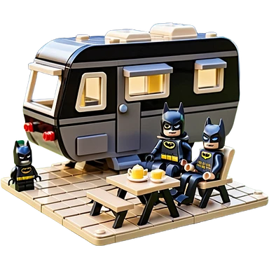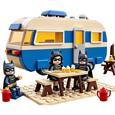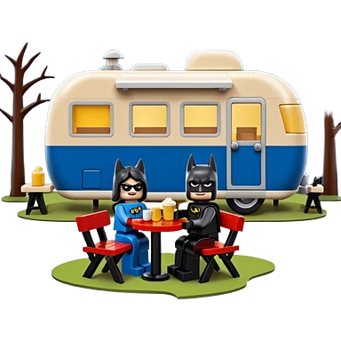 Ultra cute futuristic Lego detailed Batman and pretty Catwoman dream house Caravan with picnic table and folding chairs alone at romantic afternoon (hot chocolate and cheeseburgers on the grill) emoji