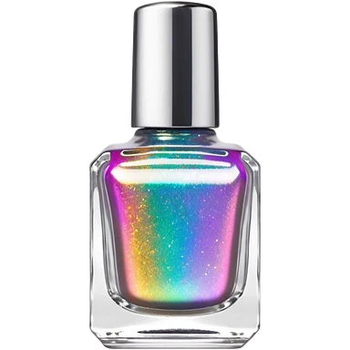 Ultra realistic, detailed, rainbow glitter effect holographic nail polish, glass translucent bottle, silver chrome lid emoji