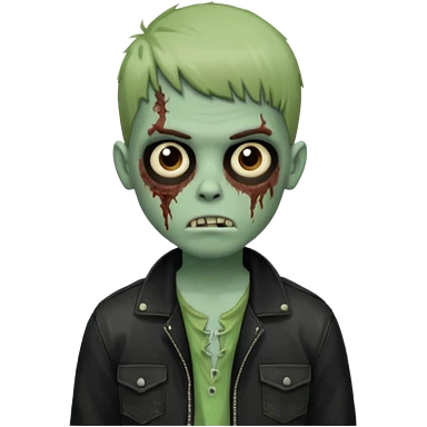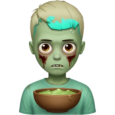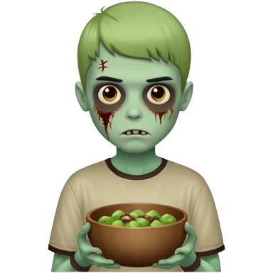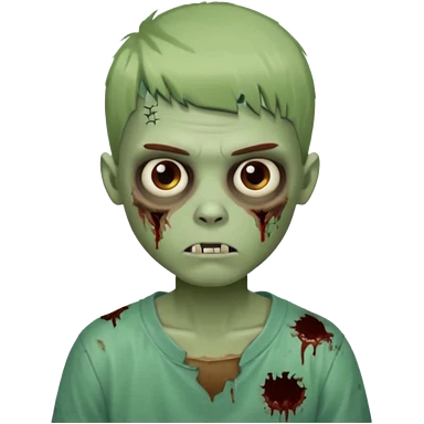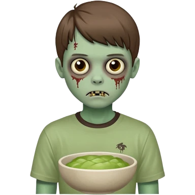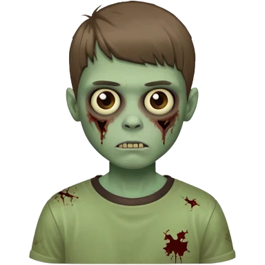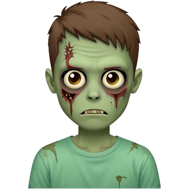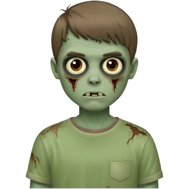 Um garoto zombie de cabelo castanho escuro, quase preto, com um cabelo médio, com olhos castanhos esverdeados, de camisa branca emoji | AI Emoji Generator