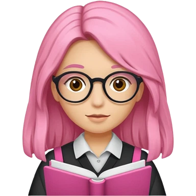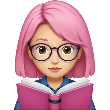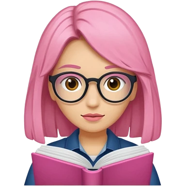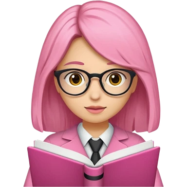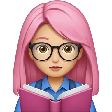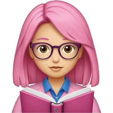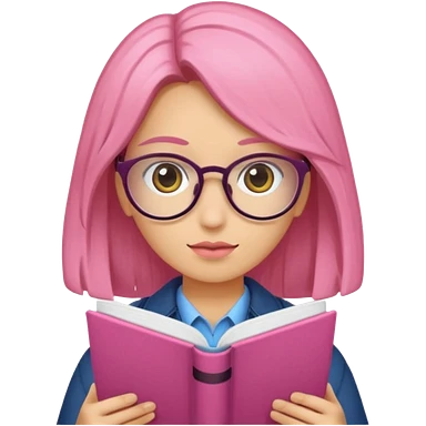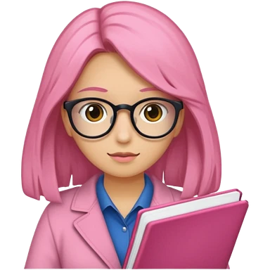 Estudante de cor parda cabelo cacheado loiro escuro de óculos segurando um caderno rosa emoji