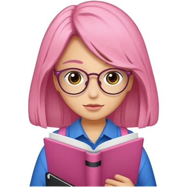 Estudante de cor parda,com o cabelo cacheado na cor loiro escuro , e de óculos segurando um caderno rosa emoji