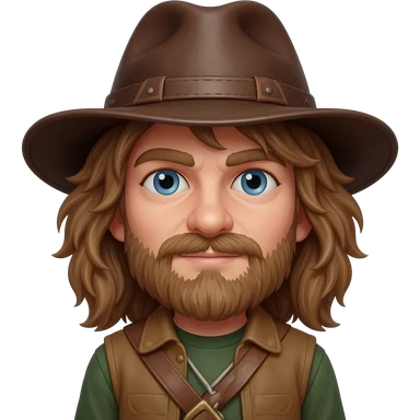 Um rosto kawaii de olhos castanhos com chapéu de aventureiro e sorrindo emoji
