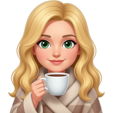 loira cabelo um pouco escuro com luzes, e mais longo, do olho verde um pouco escuro, tomando um chá de cachê, enrolada em uma coberta quentinha emoji