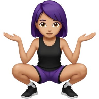 Cabelo roxo escuro grande fazendo agachamento com uma blusa grande preto e short preto emoji