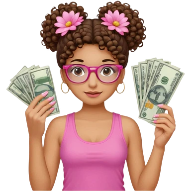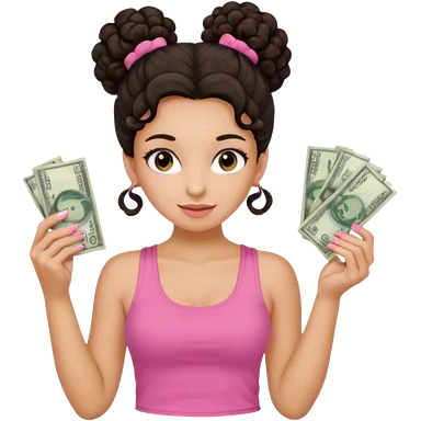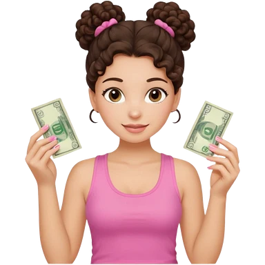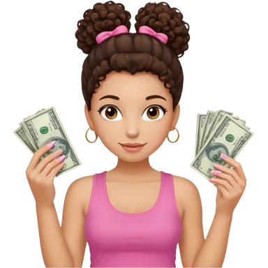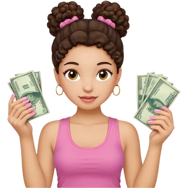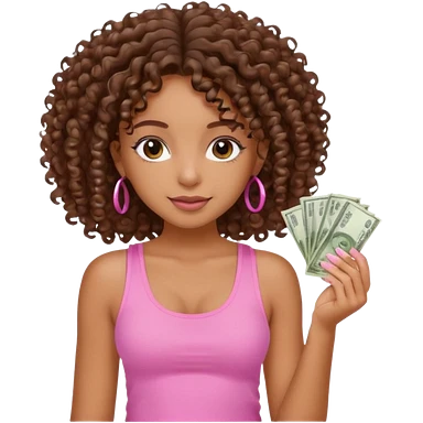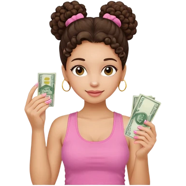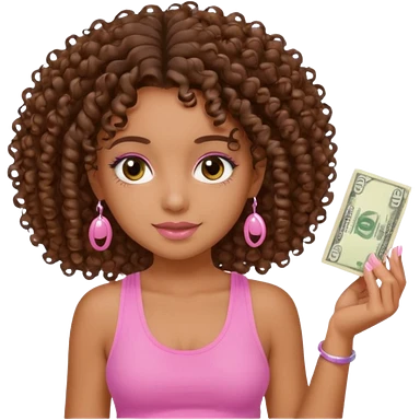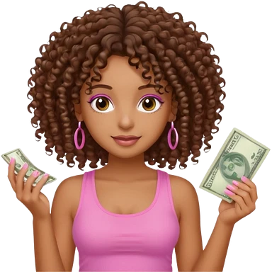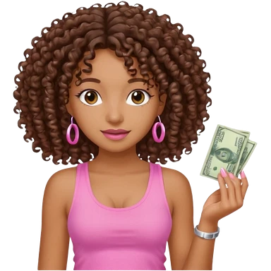 Uma menina com o cabelo cacheado com um Coque com baby hair morena, e com uma regata rosa com unha em gel,e com dinheiro na mão , emoji