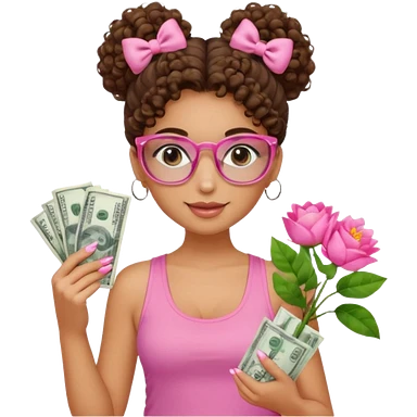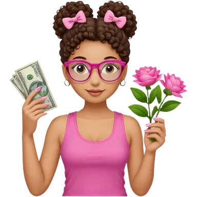Uma menina com o cabelo cacheado com um Coque com baby hair, morena, e com uma regata rosa com um gloss na frente da regata ,com unha em gel,e com dinheiro na mão ,e com flores na outra mão, com óculos emoji