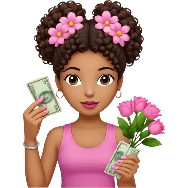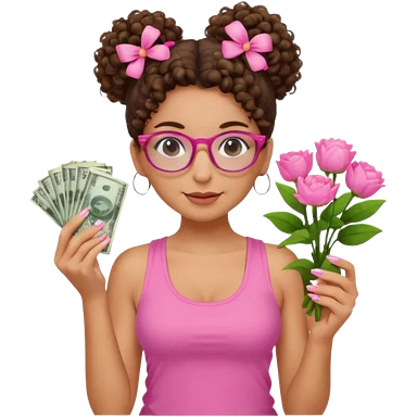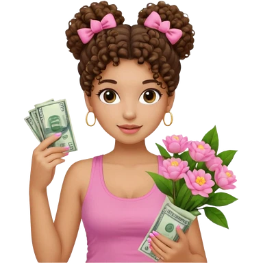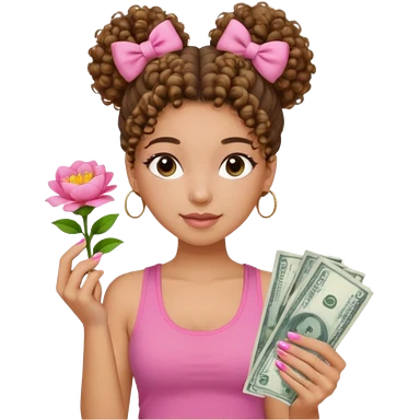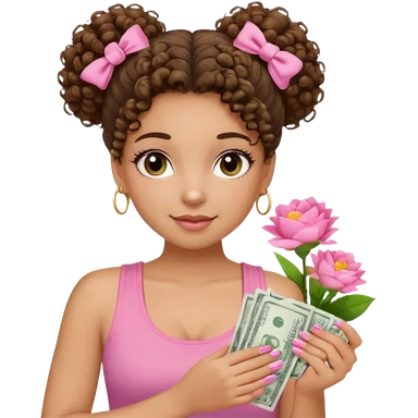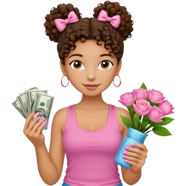 Uma menina com o cabelo cacheado com um Coque com baby hair, morena, e com uma regata rosa com um gloss na frente da regata ,com unha em gel,e com dinheiro na mão ,e com flores na outra mão, emoji