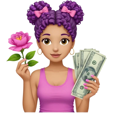 Uma menina com o cabelo cacheado com um Coque com baby hair, morena, e com uma regata rosa com unha em gel,e com dinheiro na mão ,e com flores na outra mão emoji