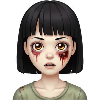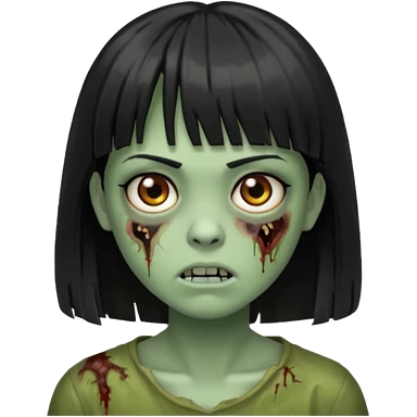 Uma zumbi com os cabelos pretos, mediano, liso e com franja, olhos castanhos emoji