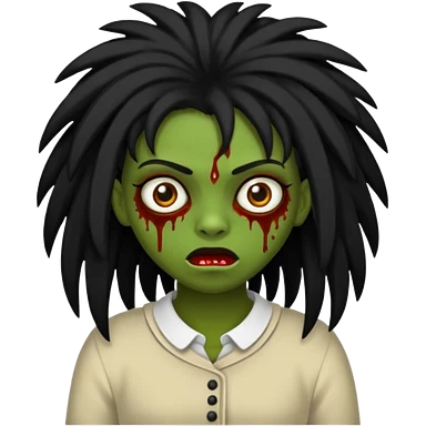 Uma zumbi com os cabelos pretos, longos, liso e com franja, olhos castanhos emoji