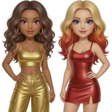 Spice Girls with Mel B with long brown curly hair, brown eyes, gold metallic crop top and baggy pants, Geri with blue eyes, blonde and red hair, red metallic short dress emoji
