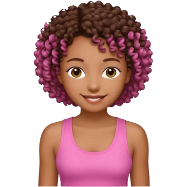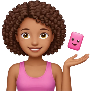 Uma menina com o cabelo cacheado curto é morena, e com uma regata rosa emoji
