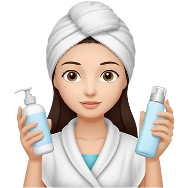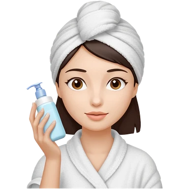 Uma mulher de toalha na cabeça pq ela acabou de sair do banho. A pele é branca/clara e cabelo marrom escuro, cabelo liso. Ela tá com um hidratante nas mãos, pq ela vai cuidar da pele emoji | AI Emoji Generator