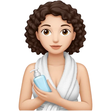 Uma mulher de toalha na cabeça pq ela acabou de sair do banho. A pele é branca/clara e cabelo marrom escuro, cabelo liso. Ela tá com um hidratante nas mãos, pq ela vai cuidar da peleemoji