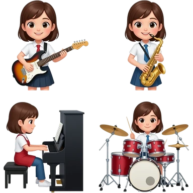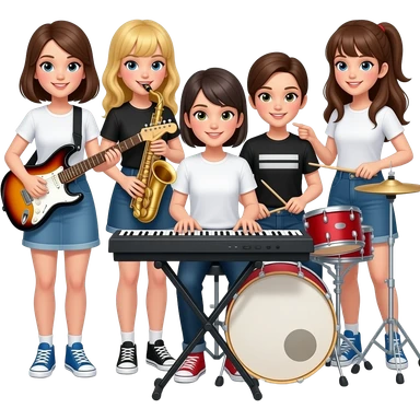 UMA GAROTA SEGURANDO UM VIOLAO, UMA GAROTA SEGURANDO UM SAXOFONE, UMA GAROTA TOCANDO TECLADO E OUTRA GAROTA TOCANDO BATERIA emoji