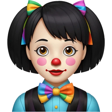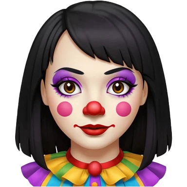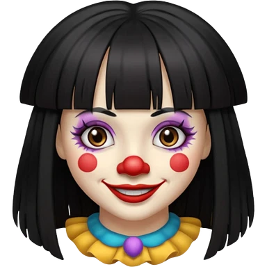 Uma palhaça om os cabelos pretos, longos, liso e com franja, olhos castanhos emoji