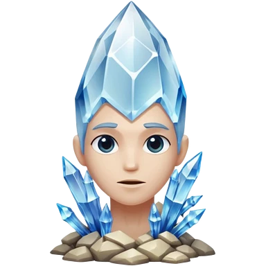 A single crystal character inspired by a clear quartz cluster, chunky base with many tall transparent crystal spikes growing upward all around it with a face emoji