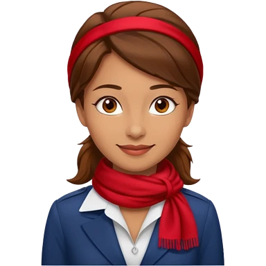 Female flight attendant, with red scarf, white shirt, brown hair, brown eyes, iOS emoji-type face emoji