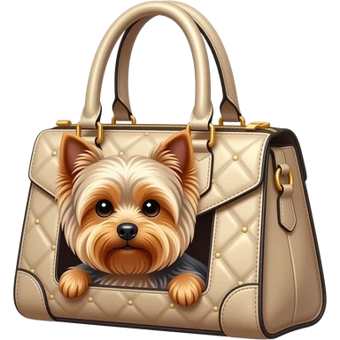Un sac de luxe avec un yorkshire assis à l'interieur. La vue est en 3/4 Ajoute subtilité pour renforcer l'impression de luxe de la scène. L'ensemble est isolée sur un fond blanc. emoji