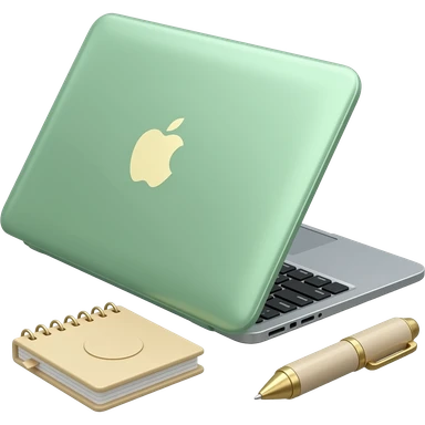 un ordianteur entre-ouvert vert pomme avec un cahier a ressort beige et un stylo kawaii a coter. La vue est en 3/4 Ajoute subtilité pour renforcer l'impression de luxe de la scène. L'ensemble est isolée sur un fond blanc. emoji