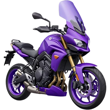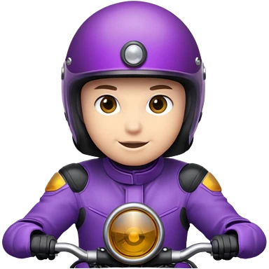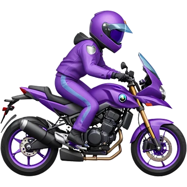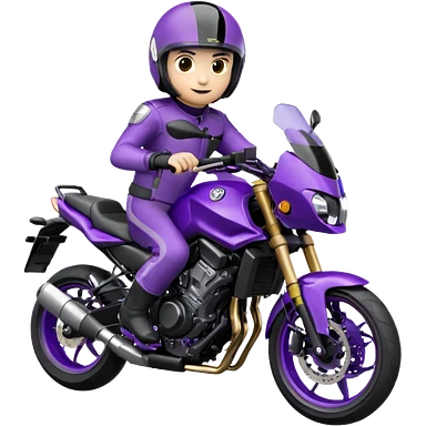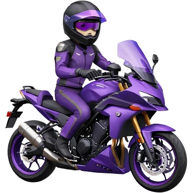 Créer un emoji avec une moto mt07 sport noir mate / violet iridescent très foncé, pare-brise de la moto violet. Avec une pilote dessus visière violet sombre visage caché . Avec fond arrière violet en arrière plan. emoji