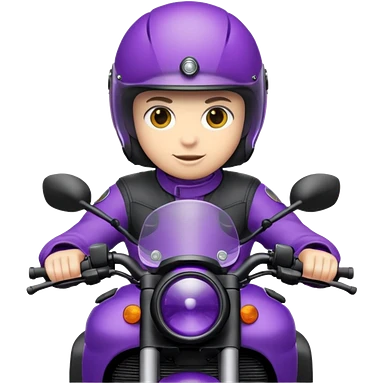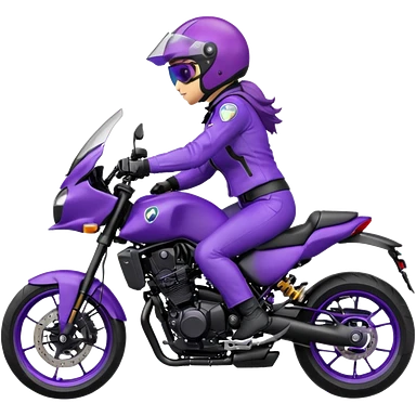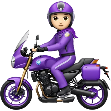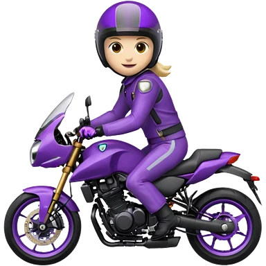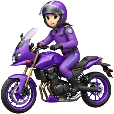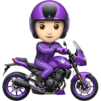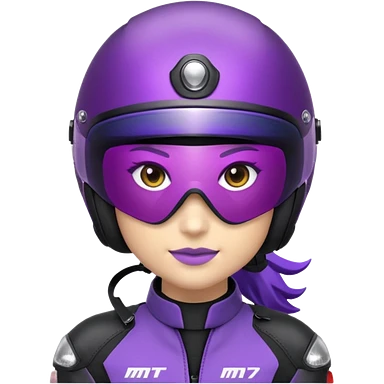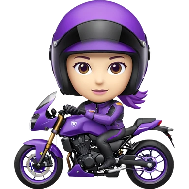 Créer un emoji avec une moto mt07 sport noir mate / violet iridescent très foncé, pare-brise de la moto violet. Avec une femme pilote dessus, visage caché’ par la visière violette, visière cachant tout le visage .Avec en arrière plan cercle violet. emoji
