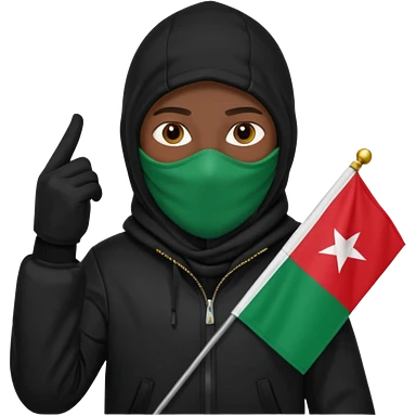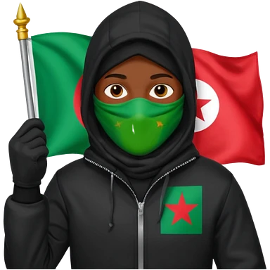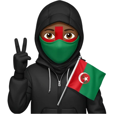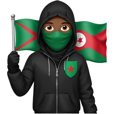 fait une personne habiller tout en noir avec une veste et une capuche et une cagoule qui tient un drapeua d'algerie dans sa main droite emoji