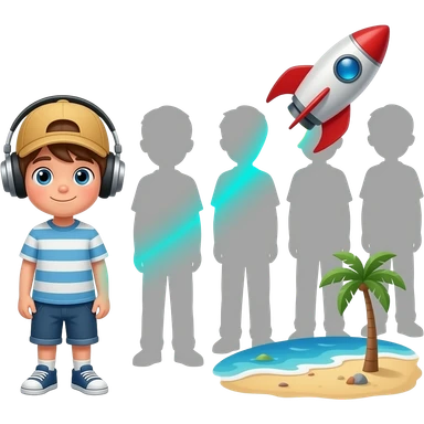 Emoji vectorial animado minimalista: Chamo aburrido (gorra atrás, audífonos) en cola interminable gris 'EL PASADO'. Ve luz turquesa, se transforma en cohete, vuela dejando estela 'LIBERTAD', aterriza en playa 'Tierra de Gracia' haciendo OK. Loop seamless." emoji