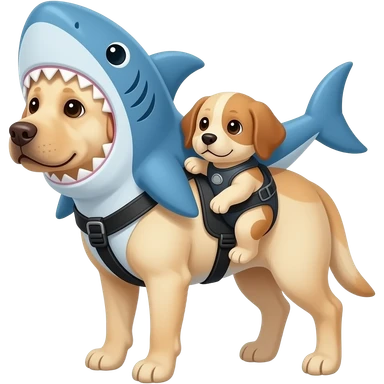 Hazme un emoji de un perro labrador,con un traje de tiburón azul,y haz que lleve en un arnés a otro perro bebe,y también haz que el papá sea pequeño emoji