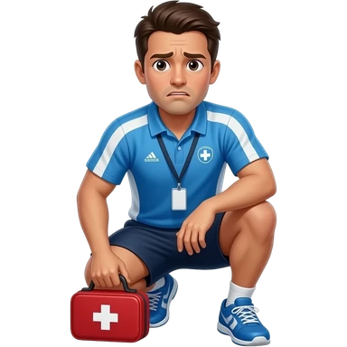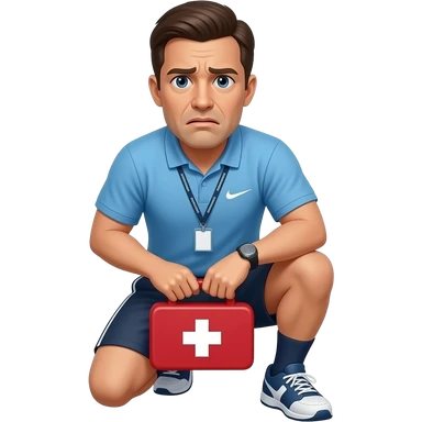 hazme un entrenador con ropa de esportista agachado i con un botiquin i que este preocupado i mirando para un lado emoji