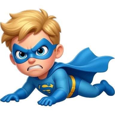 quiero que me hagas a una superheroe con el pelo rubio mascara azul i con un traje azul que sea una niño tirado en el suelo enfadado emoji