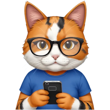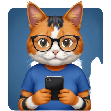 un gato de tres colores naranja, negro y blanco con gafas de leer con un celular en manos leyendo comentarios y que tenga una remera color azul oscuro que diga UOM emoji