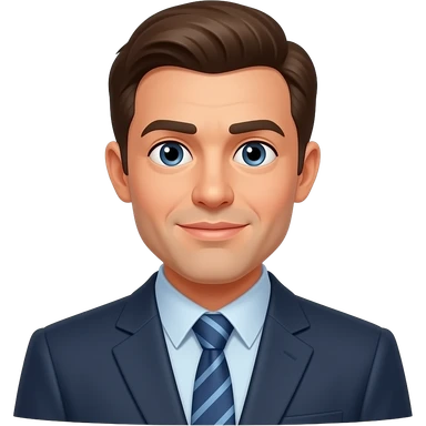 un homme type caucasien brun plutôt jeune avec des jolies traits avec une chemise blanche et une veste a manche longues et cravate bleu il a les yeux marron emoji