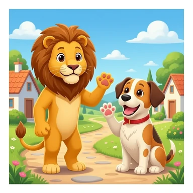 UN Lleo i un gos dier adeu amb la ma i en un poble com les fotos que mas fet avans la matexa foto pero el iieo si pot ser santat i seludan emoji