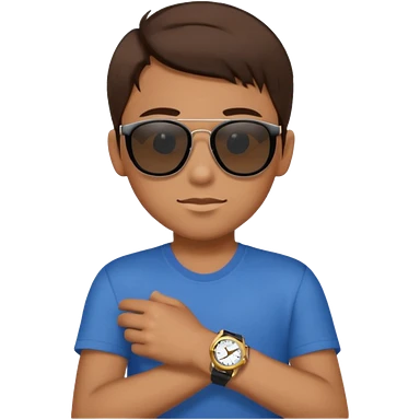 Un niño con pelo lacio color castaño,con lentes de sol negros y un reloj en la mano emoji