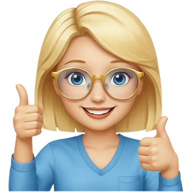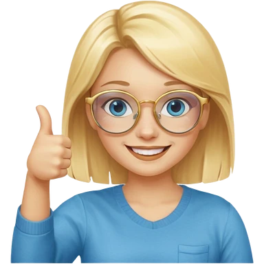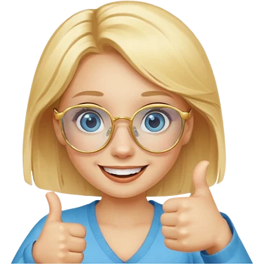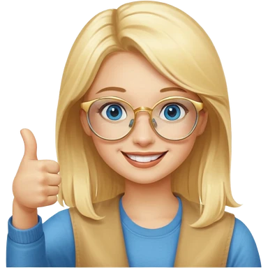 une fille blonde au yeux bleus avec des lunette dorée assez grande joyeuse avec un pouce lever emoji