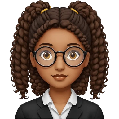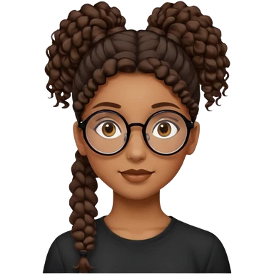 chica morena de ojos claros con gafas negras exagonales redondeadas. y pelo rizado castaño con todo el pelo recogido en una coleta .. Con todo el pelo recogido un clen look solamente una coleta tiene 16 años. hazlo como la segunda imagen pero sin el moño emoji