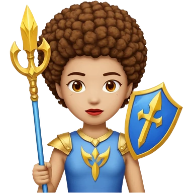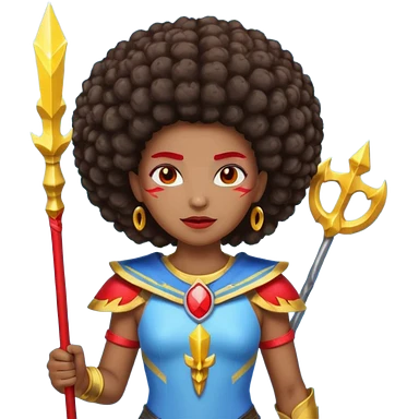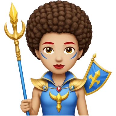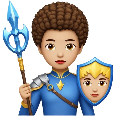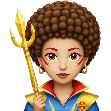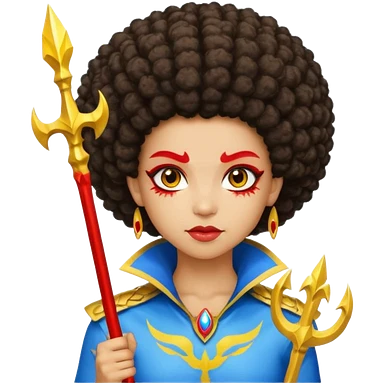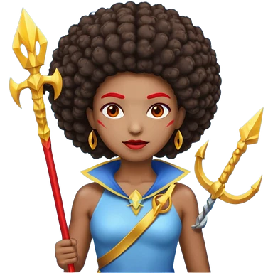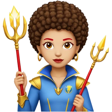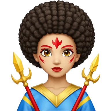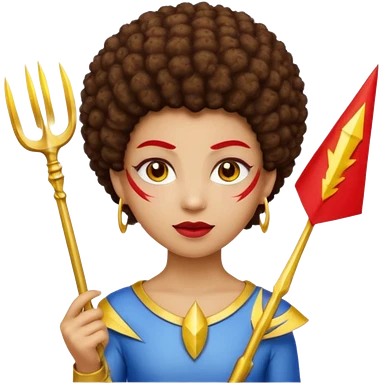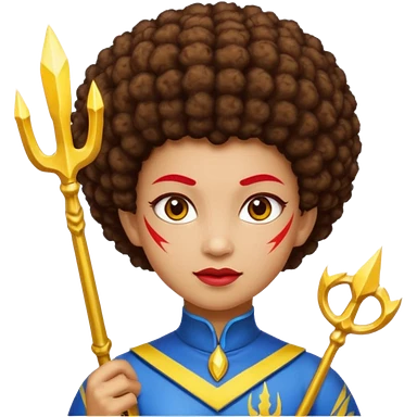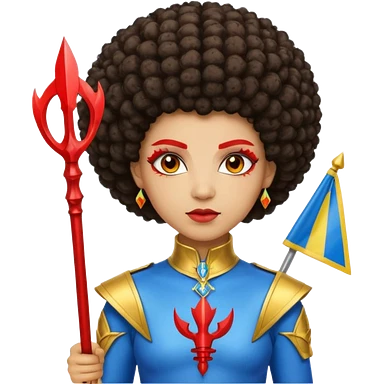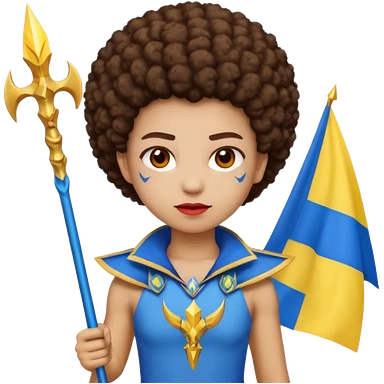 Emoji metisse femboy mais plus masculin avec drapeau ukrainien arriere plan, un afro, sourcils rouge, fourche trident, et eclairs et sur fond bleu clair irrisé. emoji