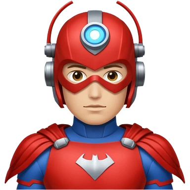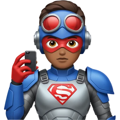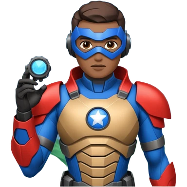 Un photographe homme high tech, une armure de terrain à la super héro. Il a des appareils photos, des caméras embarquées et un drone derrière lui en hauteur. emoji | AI Emoji Generator