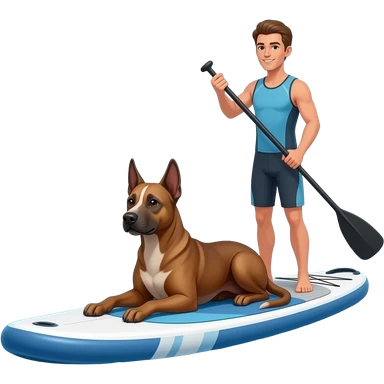 A Podenco portugais white-coffee coloured dog race type slim Podenco (joung adult) is lying down sphinx like on a sup in front front of a real paddling standing paddler on the same sup-board in real proportions to the 12.6” board and paddler on sea emoji
