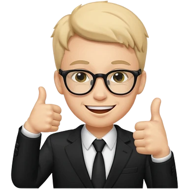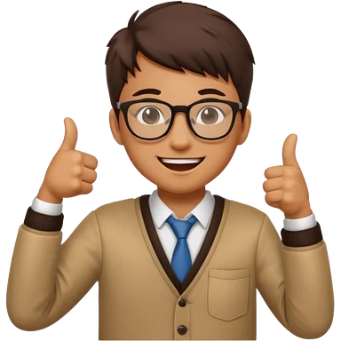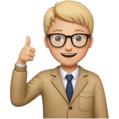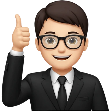 un PROFESOR con terno negro que este parado con sus lentes guiñando el ojo y CON LAS MANOS HACIA ARRIBA DANDO LIKE emoji | AI Emoji Generator