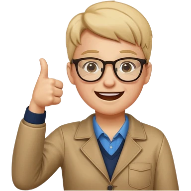 un PROFESOR que este parado con sus lentes guiñando el ojo y CON LAS MANOS HACIA ARRIBA DANDO LIKE emoji