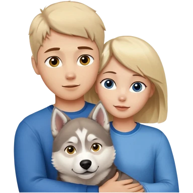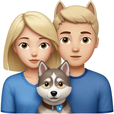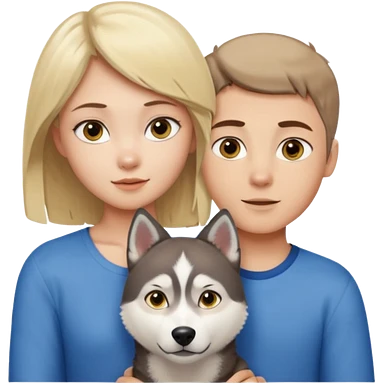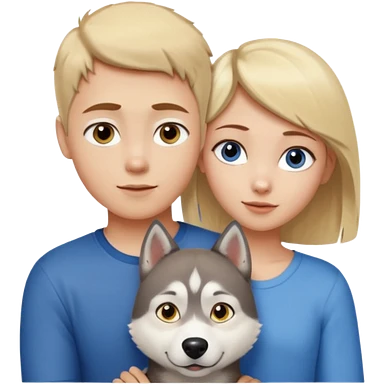 ragazza bionda occhi gialli capelli lisci biondo che abbraccia un husky occhi azzurri e un ragazzo bruno capelli corti e rasati occhi castani emoji