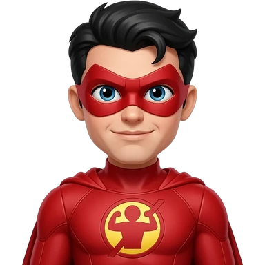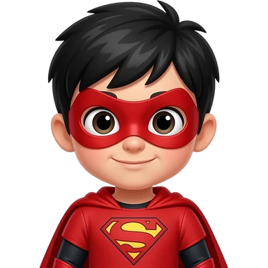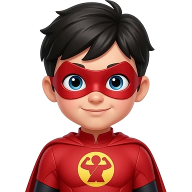 quiero que me hagas a un superheroe con el pelo negro mascara roja i con un traje rojo i un simbolo de super fuerza que sea un niño emoji
