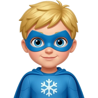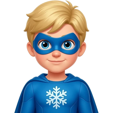 quiero que me hagas a un superheroe con el pelo rubio mascara azul i con un traje azul i un simbolo de copo de nieve que sea un niño emoji