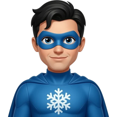 quiero que me hagas a una superheroe con el pelo negro mascara azul i con un trage azul que tenga un simbolo de un copo de nieve emoji