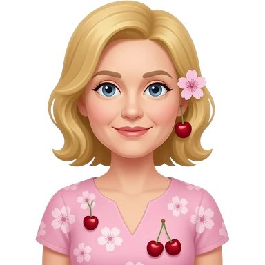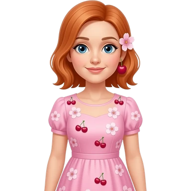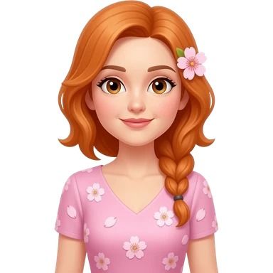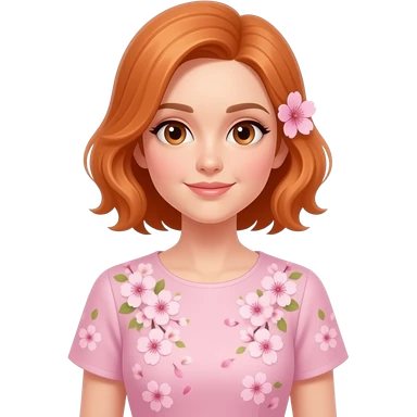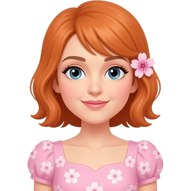 una señora de 38 años con un bestido de color rosado claro y que tenga sakuras en su bestido y una en su oreja5 y que tenga pelo amaranjado y que mire sin una sonrisa y que tenga ojos del tiempo emoji