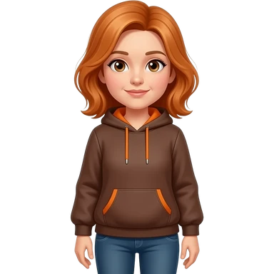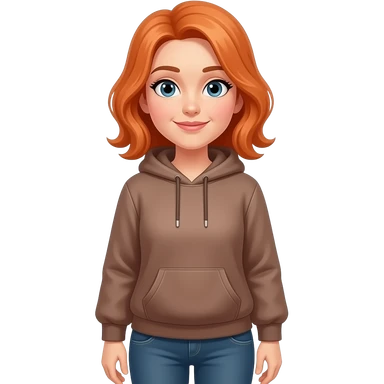 una señora de 38 años con sudadera marron amarangado com pelo amaranjado y pantalonescasuale y que mire sin una sonrisa y que tenga ojos del tiempo emoji