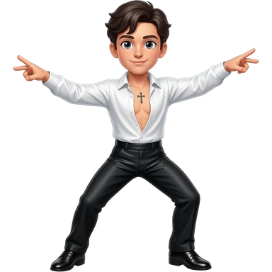 Un chico bailando salsa, tiene camisa manga larga blanca de satín por dentro y abierta hasta el ombligo Tiene una pequeña cruz de tatuaje en la parte baja del pecho. Tiene un pantalón negro brillante, con zapatos negros brillantes y Tiene el cabello oscuro emoji