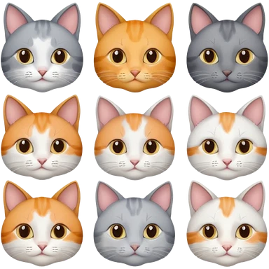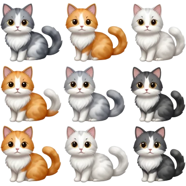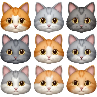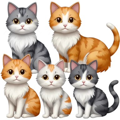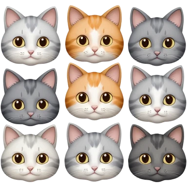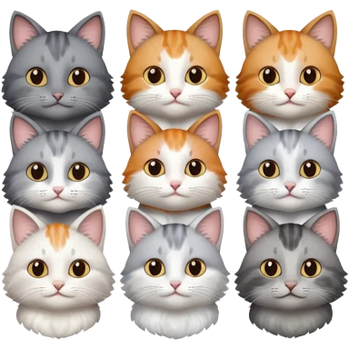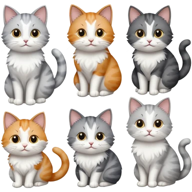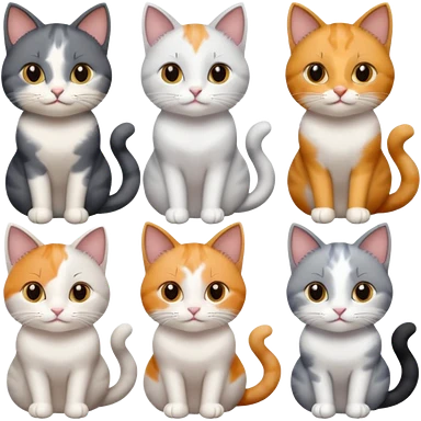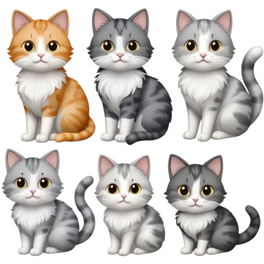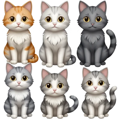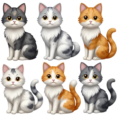 6 realistic looking cats with different natural coloured coats, assorted grey and white, greys, calicos etc emoji